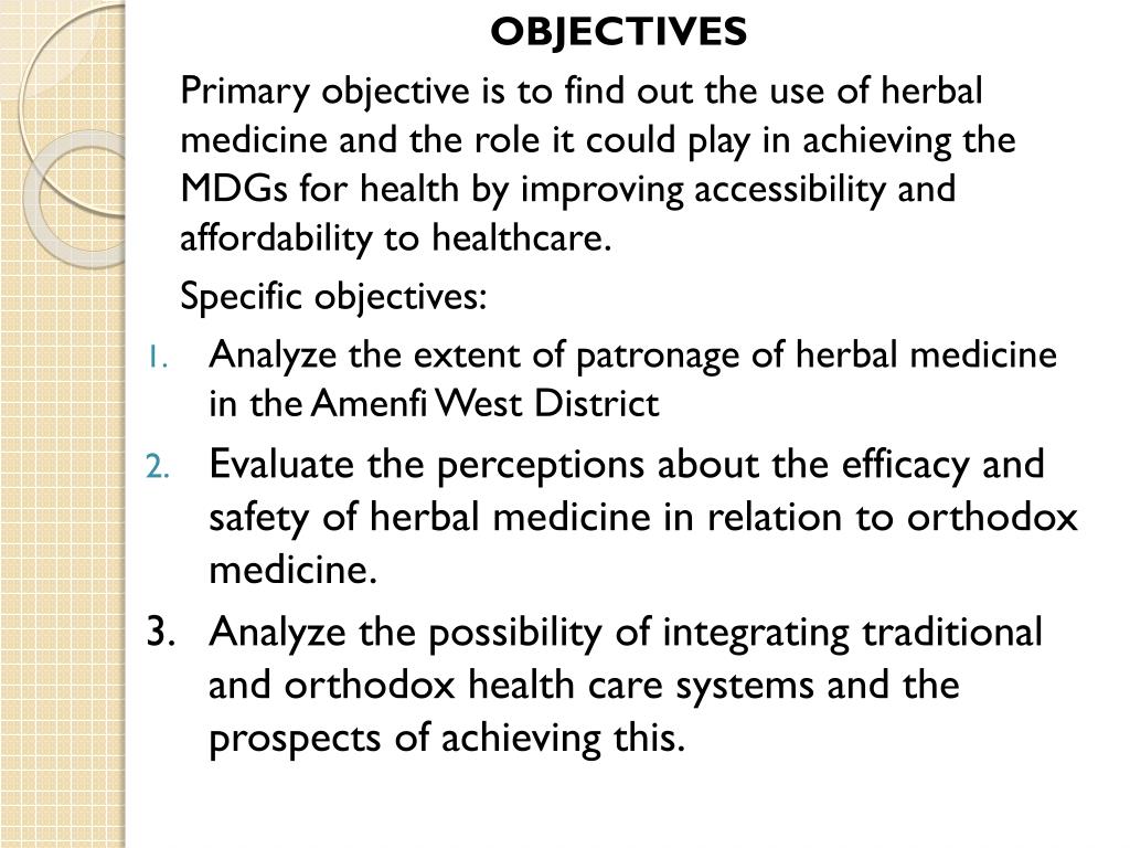 OBJECTIVES Primary objective is to find out the use of herbal medicine and the role it could play in achieving the MDGs for health by improving accessibility and affordability to healthcare. Specific objectives: • Analyze the extent of patronage of herbal medicine in the Amenfi West District • Evaluate the perceptions about the efficacy and safety of herbal medicine in relation to orthodox medicine. 3. Analyze the possibility of integrating traditional and orthodox health care systems and the prospects of achieving this.