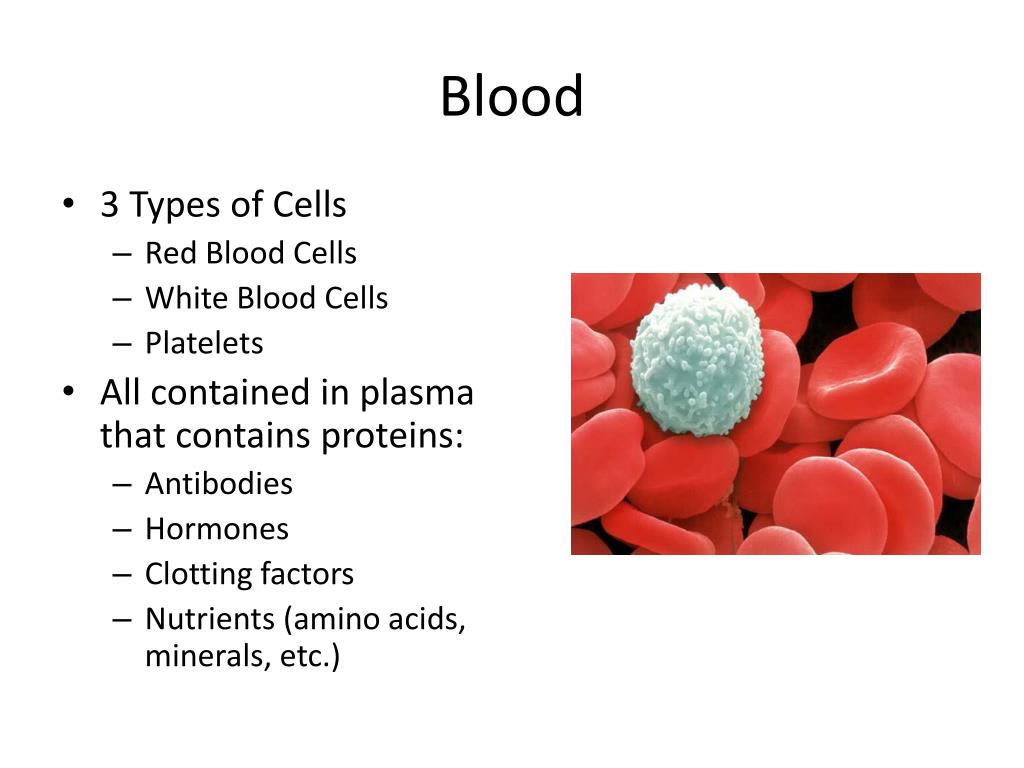Blood • 3 Types of Cells • Red Blood Cells • White Blood Cells • Platelets • All contained in plasma that contains proteins: • Antibodies • Hormones • Clotting factors • Nutrients (amino acids, minerals, etc.)