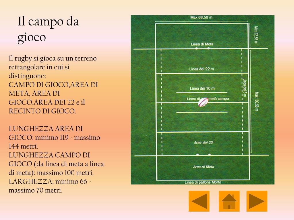 Il campo da gioco Il rugby si gioca su un terreno rettangolare in cui si distinguono: CAMPO DI GIOCO,AREA DI META, AREA DI GIOCO,AREA DEI 22 e il RECINTO DI GIOCO. LUNGHEZZA AREA DI GIOCO: minimo 119 - massimo 144 metri. LUNGHEZZA CAMPO DI GIOCO (da linea di meta a linea di meta): massimo 100 metri. LARGHEZZA: minimo 66 - massimo 70 metri.