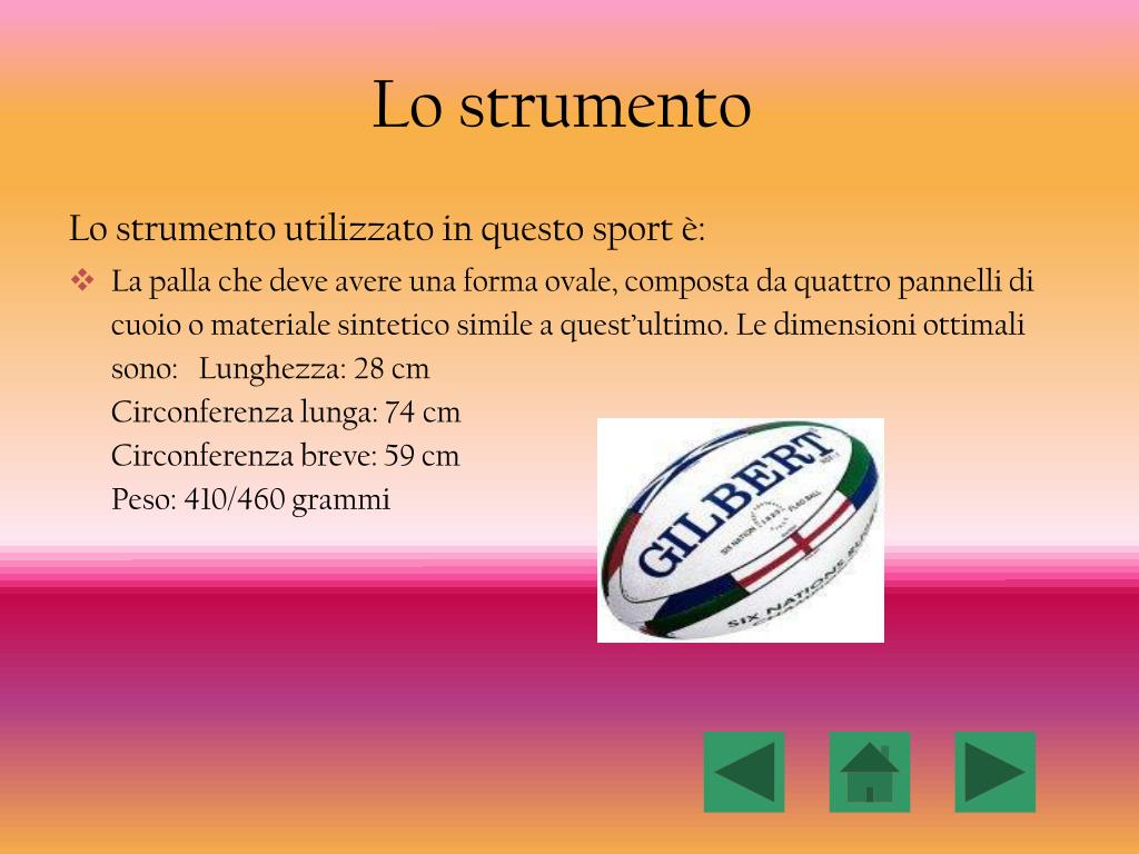Lo strumento Lo strumento utilizzato in questo sport è: • La palla che deve avere una forma ovale, composta da quattro pannelli di cuoio o materiale sintetico simile a quest’ultimo. Le dimensioni ottimali sono: Lunghezza: 28 cm Circonferenza lunga: 74 cm Circonferenza breve: 59 cm Peso: 410/460 grammi