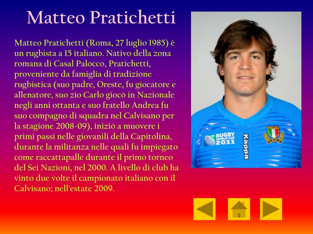 Matteo Pratichetti Matteo Pratichetti (Roma, 27 luglio 1985) è un rugbista a 15 italiano. Nativo della zona romana di Casal Palocco, Pratichetti, proveniente da famiglia di tradizione rugbistica (suo padre, Oreste, fu giocatore e allenatore, suo zio Carlo giocò in Nazionale negli anni ottanta e suo fratello Andrea fu suo compagno di squadra nel Calvisano per la stagione 2008-09), iniziò a muovere i primi passi nelle giovanili della Capitolina, durante la militanza nelle quali fu impiegato come raccattapalle durante il primo torneo del Sei Nazioni, nel 2000. A livello di club ha vinto due volte il campionato italiano con il Calvisano; nell'estate 2009.
