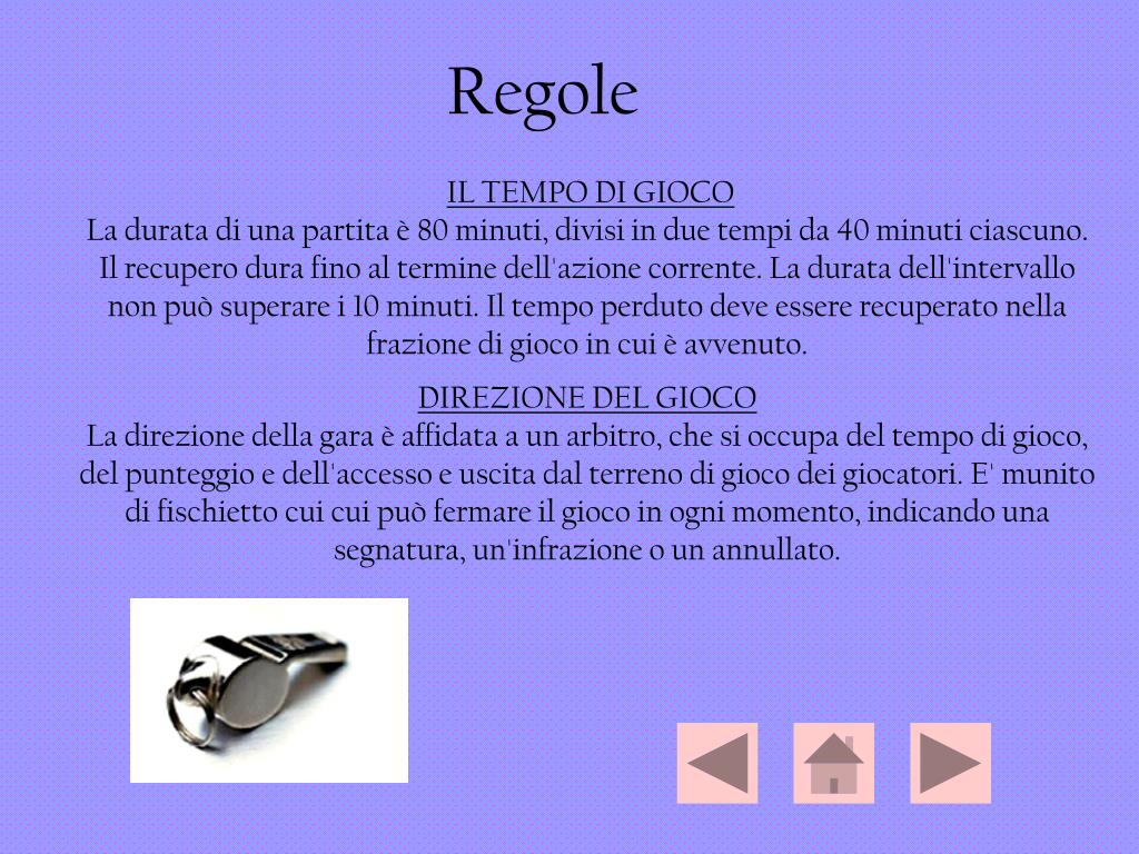 Regole IL TEMPO DI GIOCO La durata di una partita è 80 minuti, divisi in due tempi da 40 minuti ciascuno. Il recupero dura fino al termine dell'azione corrente. La durata dell'intervallo non può superare i 10 minuti. Il tempo perduto deve essere recuperato nella frazione di gioco in cui è avvenuto. DIREZIONE DEL GIOCO La direzione della gara è affidata a un arbitro, che si occupa del tempo di gioco, del punteggio e dell'accesso e uscita dal terreno di gioco dei giocatori. E' munito di fischietto cui cui può fermare il gioco in ogni momento, indicando una segnatura, un'infrazione o un annullato.