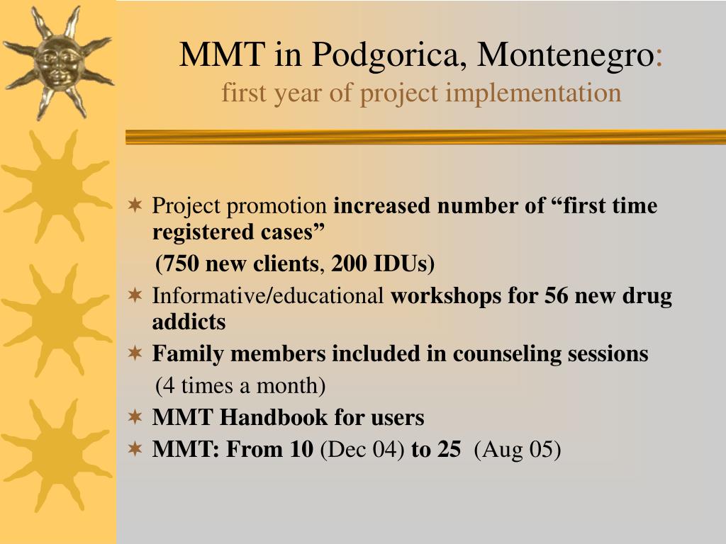 MMT in Podgorica, Montenegro:first year of project implementation • Project promotion increased number of “first time registered cases” (750 new clients, 200 IDUs) • Informative/educational workshops for 56 new drug addicts • Family members included in counseling sessions (4 times a month) • MMT Handbook for users • MMT: From 10 (Dec 04) to 25 (Aug 05)