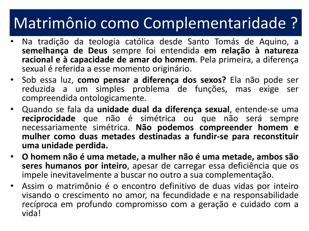 Matrimônio como Complementaridade ? • Na tradição da teologia católica desde Santo Tomás de Aquino, a semelhança de Deus sempre foi entendida em relação à natureza racional e à capacidade de amar do homem. Pela primeira, a diferença sexual é referida a esse momento originário. • Sob essa luz, como pensar a diferença dos sexos? Ela não pode ser reduzida a um simples problema de funções, mas exige ser compreendida ontologicamente. • Quando se fala da unidade dual da diferença sexual, entende-se uma reciprocidade que não é simétrica ou que não será sempre necessariamente simétrica. Não podemos compreender homem e mulher como duas metades destinadas a fundir-se para reconstituir uma unidade perdida. • O homem não é uma metade, a mulher não é uma metade, ambos são seres humanos por inteiro, apesar de carregar essa deficiência que os impele inevitavelmente a buscar no outro a sua complementação. • Assim o matrimônio é o encontro definitivo de duas vidas por inteiro visando o crescimento no amor, na fecundidade e na responsabilidade recíproca em profundo compromisso com a geração e cuidado com a vida!