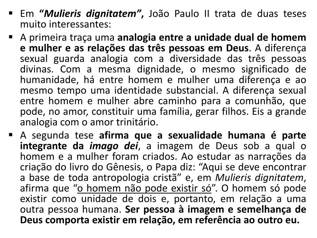 Em “Mulierisdignitatem”, João Paulo II trata de duas teses muito interessantes: • A primeira traça uma analogia entre a unidade dual de homem e mulher e as relações das três pessoas em Deus. A diferença sexual guarda analogia com a diversidade das três pessoas divinas. Com a mesma dignidade, o mesmo significado de humanidade, há entre homem e mulher uma diferença e ao mesmo tempo uma identidade substancial. A diferença sexual entre homem e mulher abre caminho para a comunhão, que pode, no amor, constituir uma família, gerar filhos. Eis a grande analogia com o amor trinitário. • A segunda tese afirma que a sexualidade humana é parte integrante da imago dei, a imagem de Deus sob a qual o homem e a mulher foram criados. Ao estudar as narrações da criação do livro do Gênesis, o Papa diz: “Aqui se deve encontrar a base de toda antropologia cristã” e, em Mulierisdignitatem, afirma que “o homem não pode existir só”. O homem só pode existir como unidade de dois e, portanto, em relação a uma outra pessoa humana. Ser pessoa à imagem e semelhança de Deus comporta existir em relação, em referência ao outro eu.