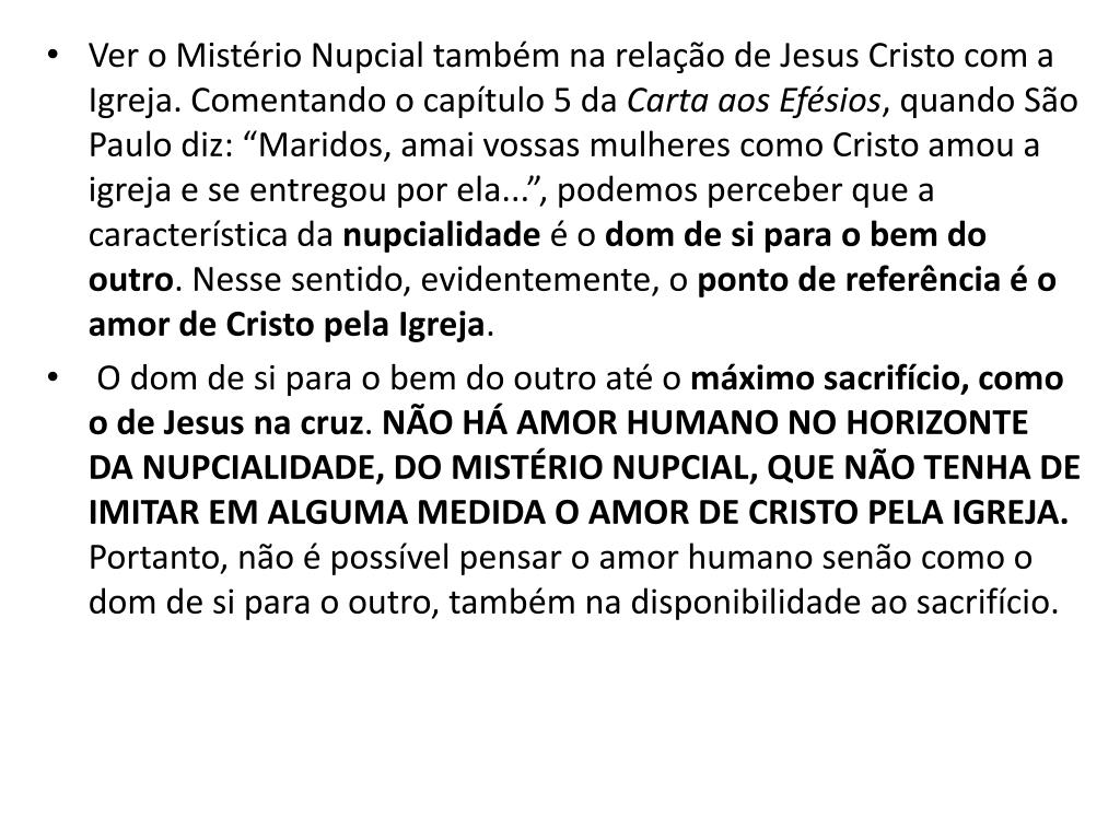 Ver o Mistério Nupcial também na relação de Jesus Cristo com a Igreja. Comentando o capítulo 5 da Carta aos Efésios, quando São Paulo diz: “Maridos, amai vossas mulheres como Cristo amou a igreja e se entregou por ela...”, podemos perceber que a característica da nupcialidade é o dom de si para o bem do outro. Nesse sentido, evidentemente, o ponto de referência é o amor de Cristo pela Igreja. • O dom de si para o bem do outro até o máximo sacrifício, como o de Jesus na cruz. NÃO HÁ AMOR HUMANO NO HORIZONTE DA NUPCIALIDADE, DO MISTÉRIO NUPCIAL, QUE NÃO TENHA DE IMITAR EM ALGUMA MEDIDA O AMOR DE CRISTO PELA IGREJA. Portanto, não é possível pensar o amor humano senão como o dom de si para o outro, também na disponibilidade ao sacrifício.
