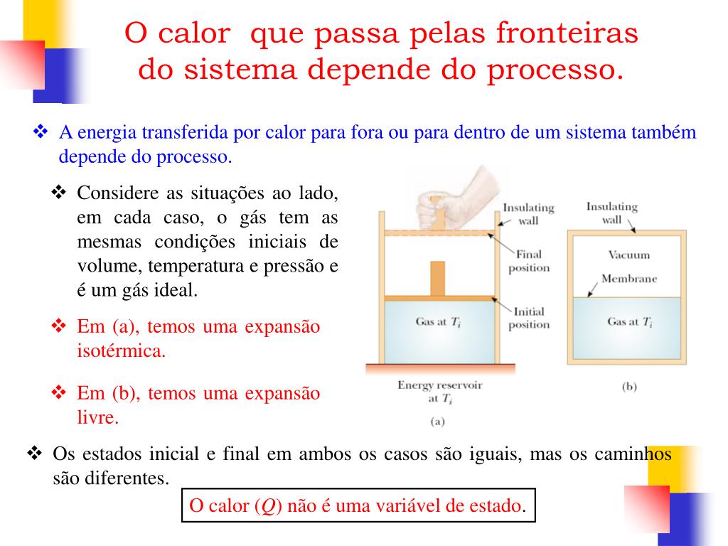 O calor que passa pelas fronteiras do sistema depende do processo. • A energia transferida por calor para fora ou para dentro de um sistema também depende do processo. • Considere as situações ao lado, em cada caso, o gás tem as mesmas condições iniciais de volume, temperatura e pressão e é um gás ideal. • Em (a), temos uma expansão isotérmica. • Em (b), temos uma expansão livre. • Os estados inicial e final em ambos os casos são iguais, mas os caminhos são diferentes. O calor (Q) não é uma variável de estado.