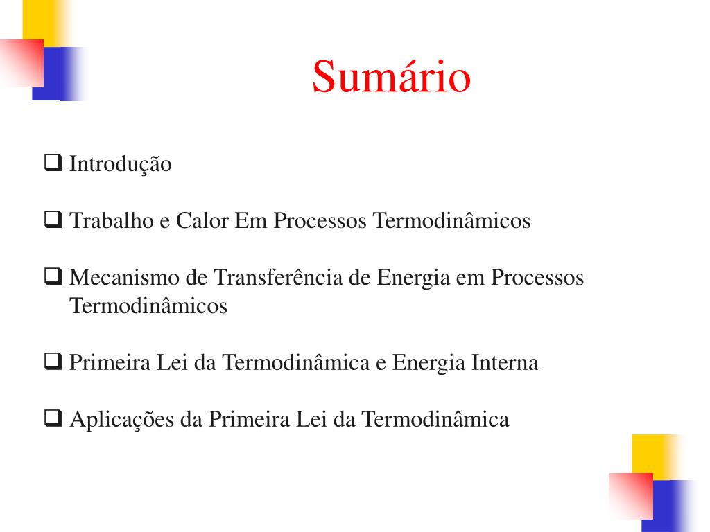 Sumário • Introdução • Trabalho e Calor Em Processos Termodinâmicos • Mecanismo de Transferência de Energia em Processos Termodinâmicos • Primeira Lei da Termodinâmica e Energia Interna • Aplicações da Primeira Lei da Termodinâmica