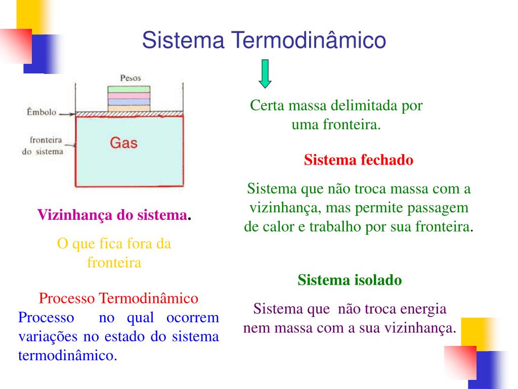 Sistema Termodinâmico Certa massa delimitada por uma fronteira. Sistema fechado Sistema que não troca massa com a vizinhança, mas permite passagem de calor e trabalho por sua fronteira. Vizinhança do sistema. O que fica fora da fronteira Sistema isolado Sistema que não troca energia nem massa com a sua vizinhança. Processo Termodinâmico Processo no qual ocorrem variações no estado do sistema termodinâmico.