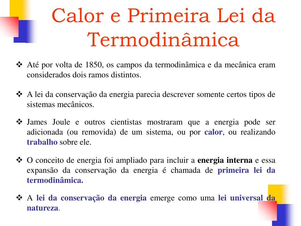 Calor e Primeira Lei da Termodinâmica • Até por volta de 1850, os campos da termodinâmica e da mecânica eram considerados dois ramos distintos. • A lei da conservação da energia parecia descrever somente certos tipos de sistemas mecânicos. • James Joule e outros cientistas mostraram que a energia pode ser adicionada (ou removida) de um sistema, ou por calor, ou realizando trabalho sobre ele. • O conceito de energia foi ampliado para incluir a energia interna eessa expansão da conservação da energia é chamada de primeira lei da termodinâmica. • Alei da conservação da energiaemerge como uma lei universal da natureza.