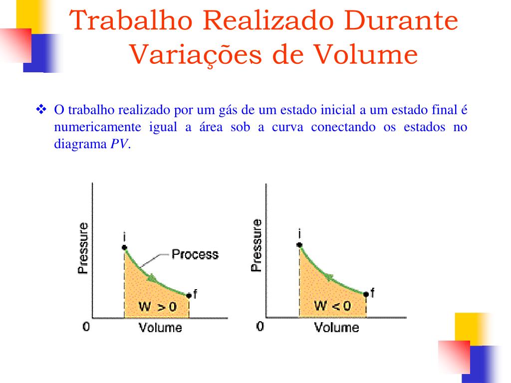 Trabalho Realizado Durante Variações de Volume • O trabalho realizado pelo gás sobre o pistão: ou O trabalho total realizado pelo gás à medida que o seu volume se altera de Vipara Vf é dado por
