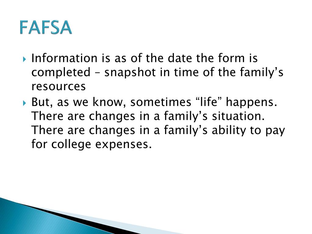 FAFSA • Information is as of the date the form is completed – snapshot in time of the family’s resources • But, as we know, sometimes “life” happens. There are changes in a family’s situation. There are changes in a family’s ability to pay for college expenses.