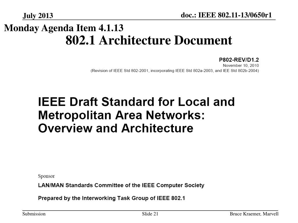 Monday Agenda Item 4.1.13 802.1 Architecture Document Bruce Kraemer, Marvell