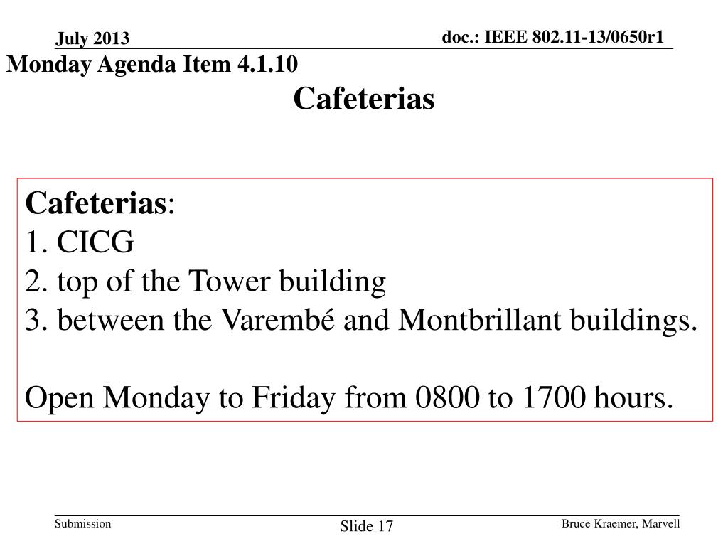 Monday Agenda Item 4.1.10 Cafeterias Cafeterias: 1. CICG 2. top of the Tower building 3. between the Varembé and Montbrillant buildings. Open Monday to Friday from 0800 to 1700 hours. Bruce Kraemer, Marvell