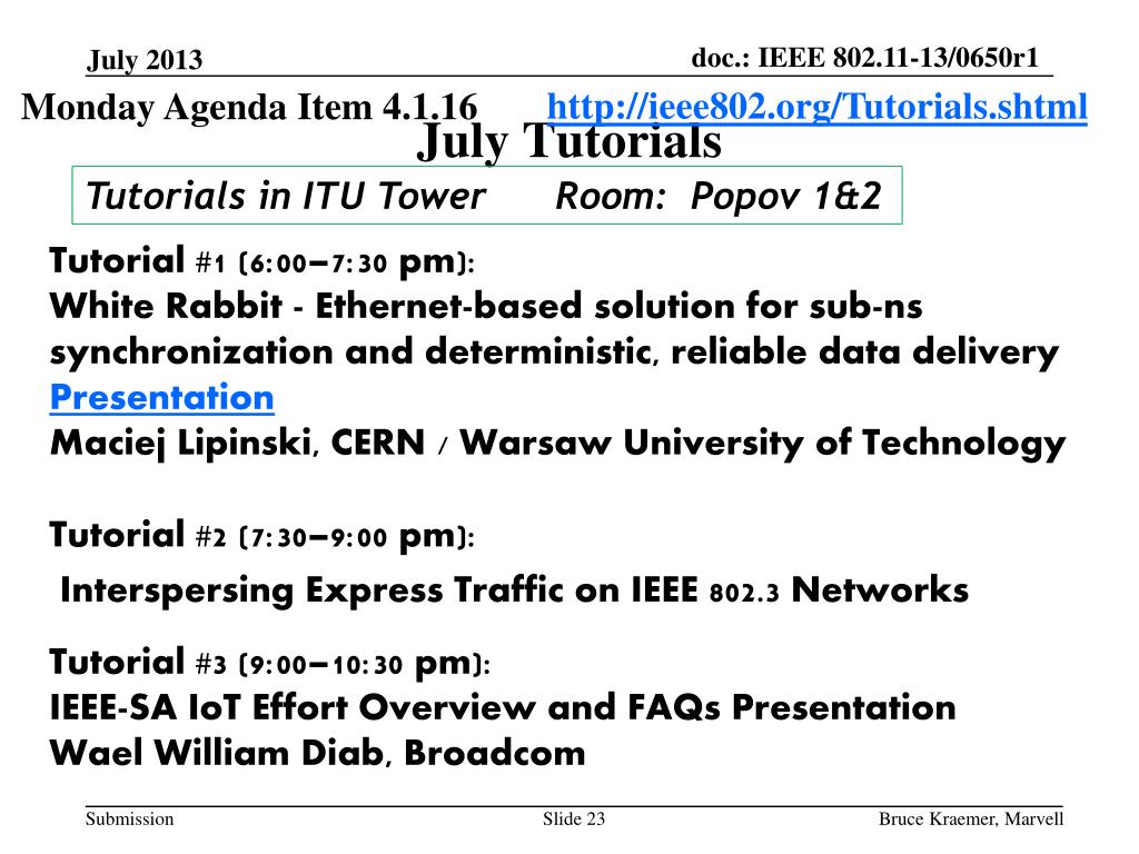 Monday, July 15, 2013 http://ieee802.org/Tutorials.shtml Monday Agenda Item 4.1.16 July Tutorials Tutorials in ITU Tower Room: Popov 1&2 Bruce Kraemer, Marvell