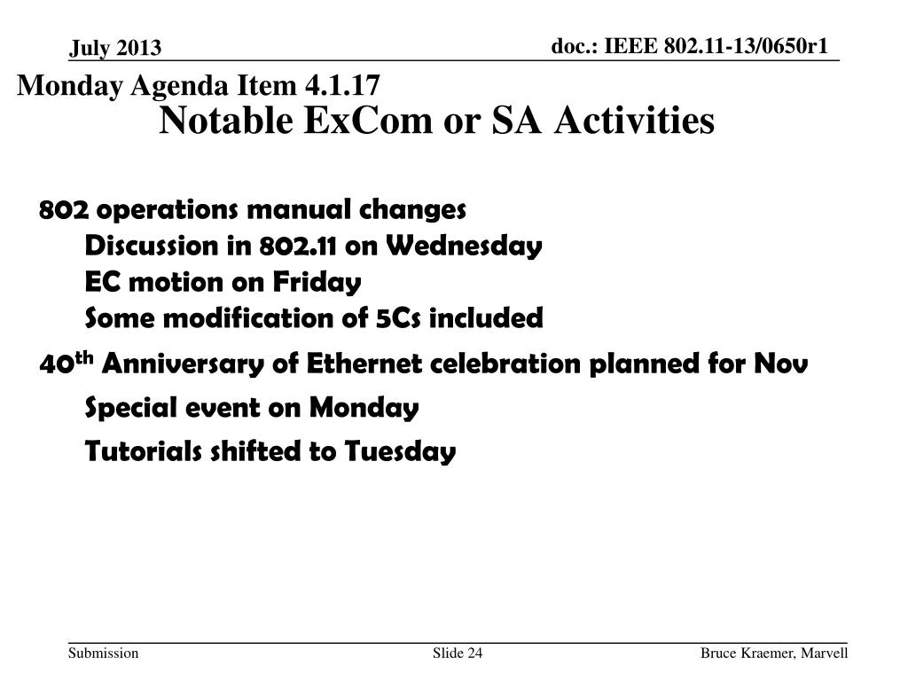 Monday, July 15, 2013 Monday Agenda Item 4.1.17 Notable ExCom or SA Activities Bruce Kraemer, Marvell