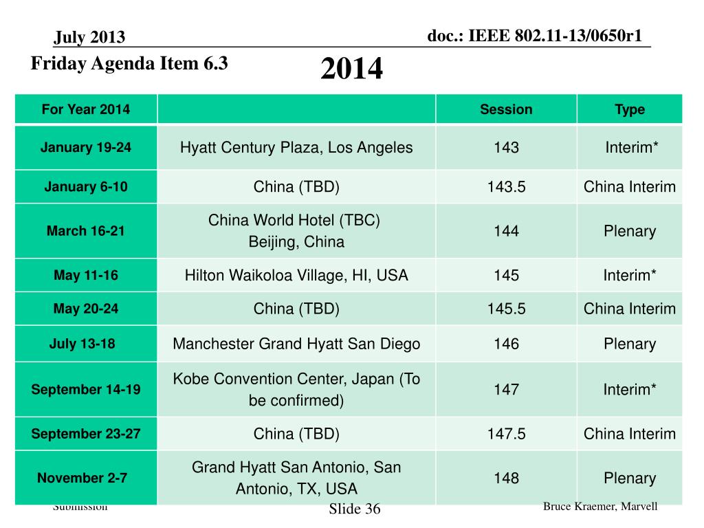 Friday Agenda Item 6.3 Future Venues - 2014 2014 # 143 January 19-24, 2014 -Hyatt Century Plaza, Los Angeles, CA, US #143.5 January 8-9, 2014 - China # 144 March 16-21, 2014 – Beijing, China # 145 May 11-16, 2014 ----Hilton Waikoloa, Big Island, HI #145.5 May21-22, 2014 - China # 146 July 13-18, 2014 - Manchester Grand Hyatt, San Diego, CA, US # 147 September 14-19, 2014----Athens, Greece #147.5 September24-25, 2014 - China # 148 November 2-7, 2014 Hyatt Regency San Antonio, TX, US Bruce Kraemer, Marvell