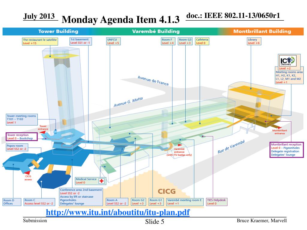 Monday Agenda Item 4.1.3 ITU Entrances There are three entrances: The Montbrillant entrance (2 rue de Varembé, extension 6788 or 6789) is open from 0600 to 2200 hours, Monday to Friday. It is here that delegate registration takes place. The Tower entrance (av. Giuseppe Motta, extension 5107 or 5108) is open every day from 0600 to 2200 hours (including weekends, but not official holidays). The Varembé entrance, accessible only to badgeholders, is open from 0600 to 2200 hours, Monday to Friday. Bruce Kraemer, Marvell