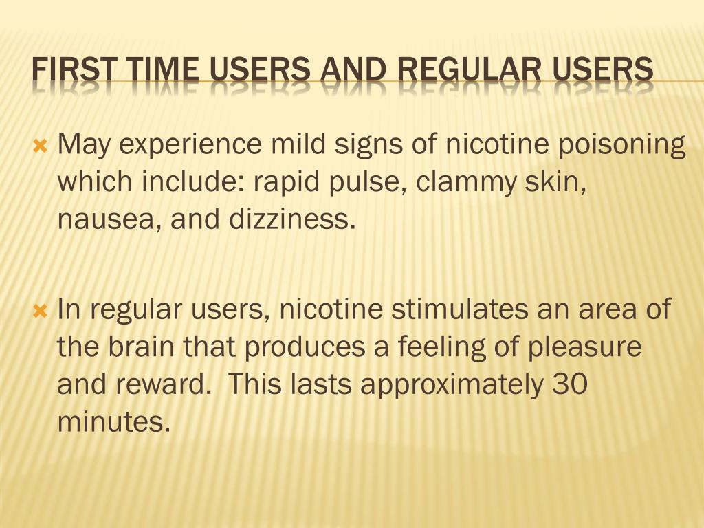 May experience mild signs of nicotine poisoning which include: rapid pulse, clammy skin, nausea, and dizziness. In regular users, nicotine stimulates an area of the brain that produces a feeling of pleasure and reward. This lasts approximately 30 minutes. First Time Users and Regular Users