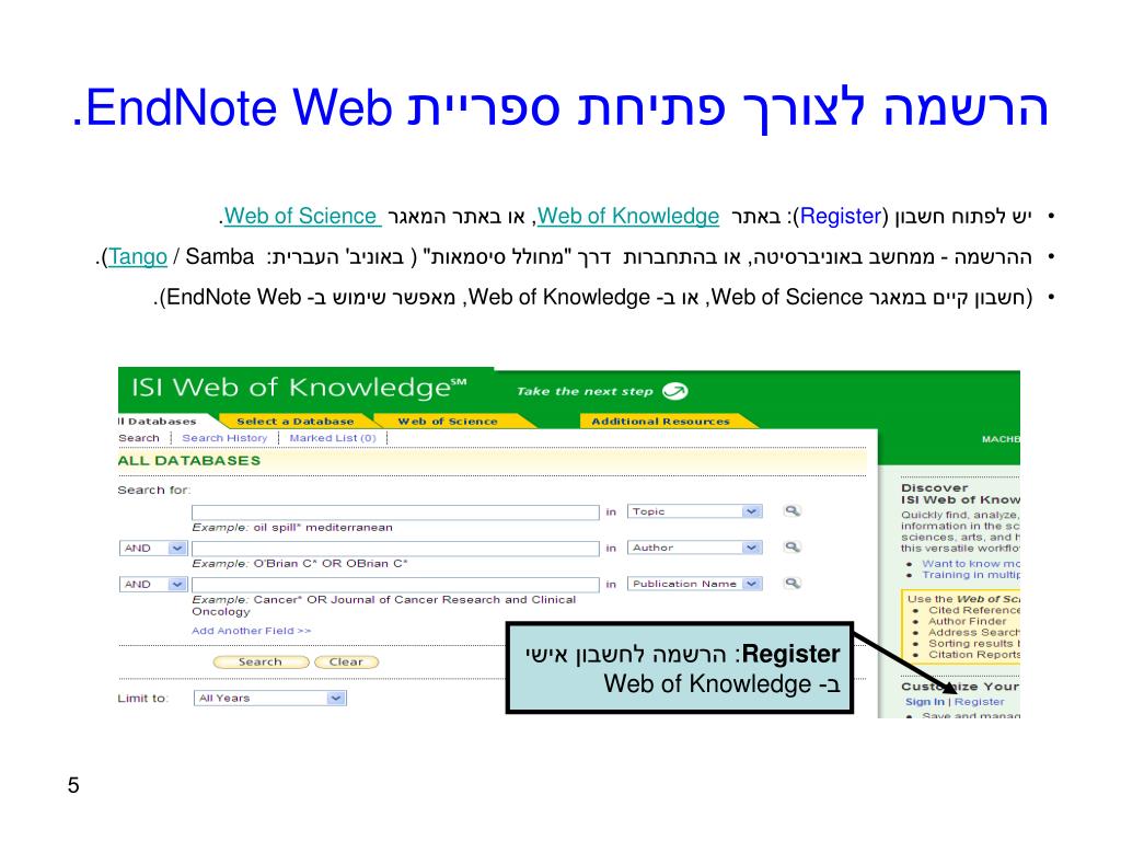 Register: הרשמה לחשבון אישי ב- Web of Knowledge הרשמה לצורך פתיחת ספריית.EndNote Web • יש לפתוח חשבון (Register): באתר Web of Knowledge, או באתר המאגר Web of Science . • ההרשמה - ממחשב באוניברסיטה, או בהתחברות דרך "מחולל סיסמאות" ( באוניב' העברית: Tango / Samba ). • (חשבון קיים במאגר Web of Science, או ב- Web of Knowledge, מאפשר שימושב-(EndNote Web .
