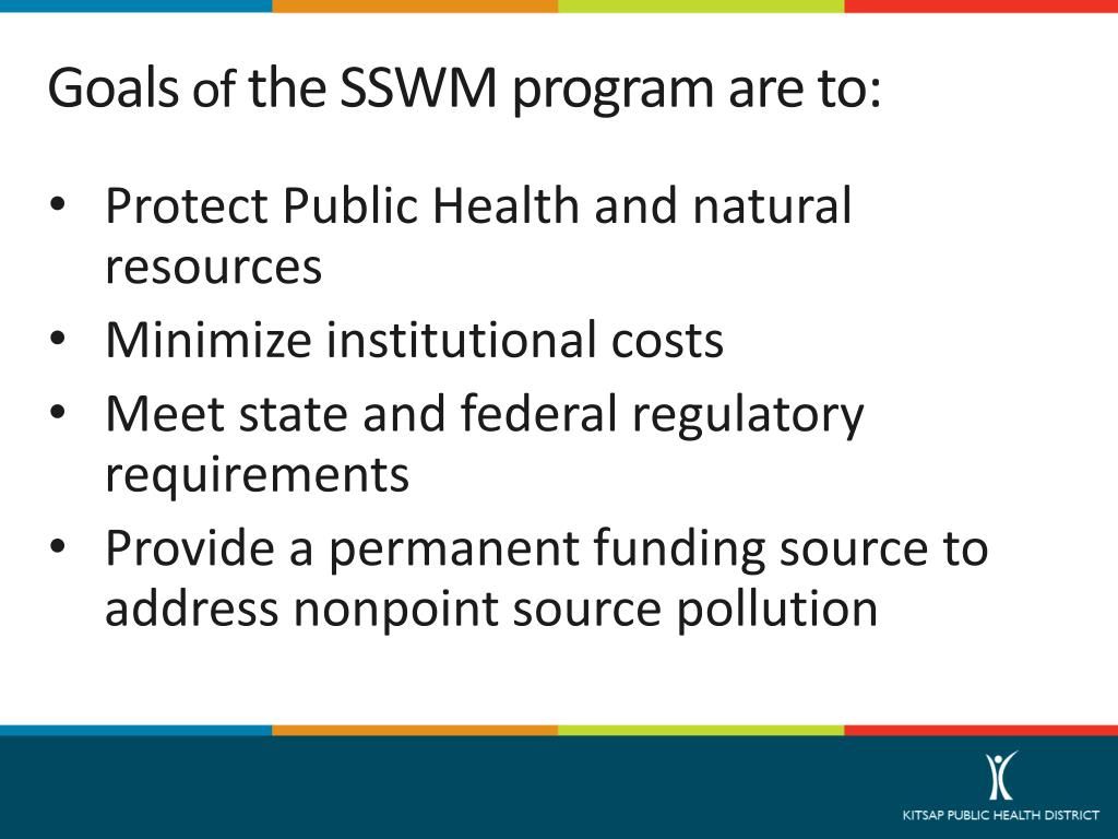 Goals of the SSWM program are to: • Protect Public Health and natural resources • Minimize institutional costs • Meet state and federal regulatory requirements • Provide a permanent funding source to address nonpoint source pollution