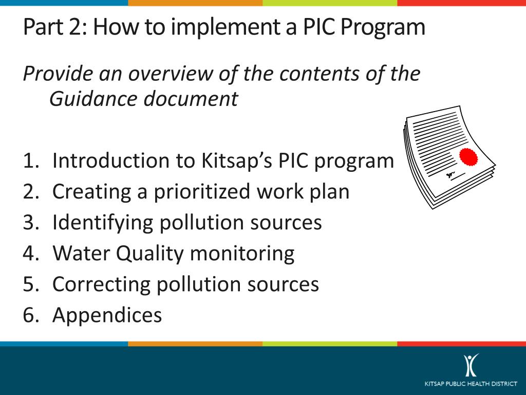 Part 2: How to implement a PIC Program Provide an overview of the contents of the Guidance document • Introduction to Kitsap’s PIC program • Creating a prioritized work plan • Identifying pollution sources • Water Quality monitoring • Correcting pollution sources • Appendices