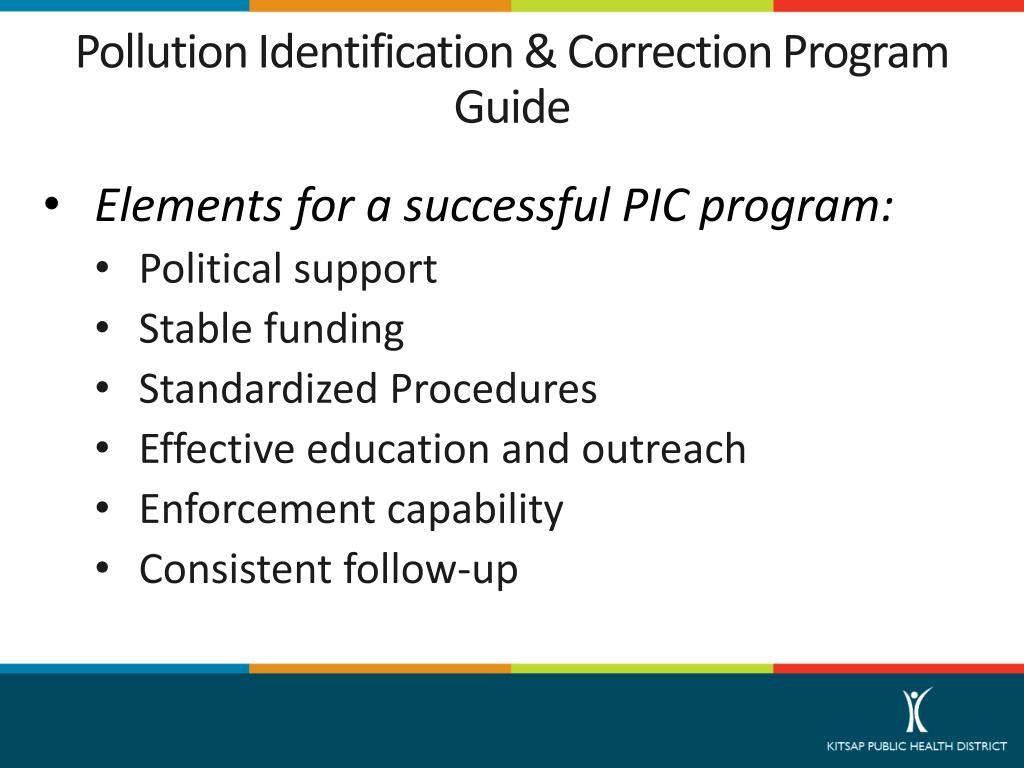 Pollution Identification & Correction Program Guide • Elements for a successful PIC program: • Political support • Stable funding • Standardized Procedures • Effective education and outreach • Enforcement capability • Consistent follow-up