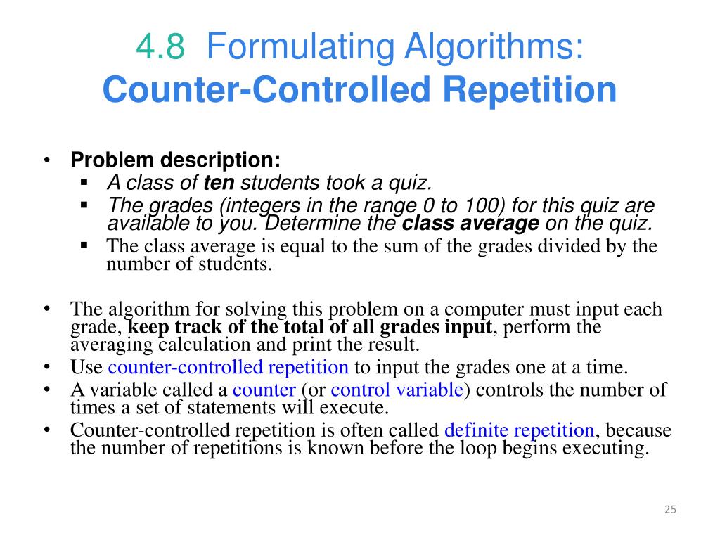 4.8Formulating Algorithms: Counter-Controlled Repetition • Problem description: • A class of ten students took a quiz. • The grades (integers in the range 0 to 100) for this quiz are available to you. Determine the class average on the quiz. • The class average is equal to the sum of the grades divided by the number of students. • The algorithm for solving this problem on a computer must input each grade, keep track of the total of all grades input, perform the averaging calculation and print the result. • Use counter-controlled repetition to input the grades one at a time. • A variable called a counter (or control variable) controls the number of times a set of statements will execute. • Counter-controlled repetition is often called definite repetition, because the number of repetitions is known before the loop begins executing.