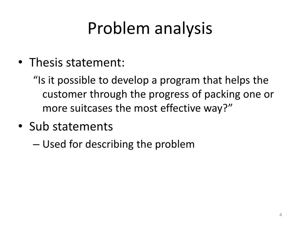 Problem analysis • Thesis statement: “Is it possible to develop a program that helps the customer through the progress of packing one or more suitcases the most effective way?” • Sub statements • Used for describing the problem