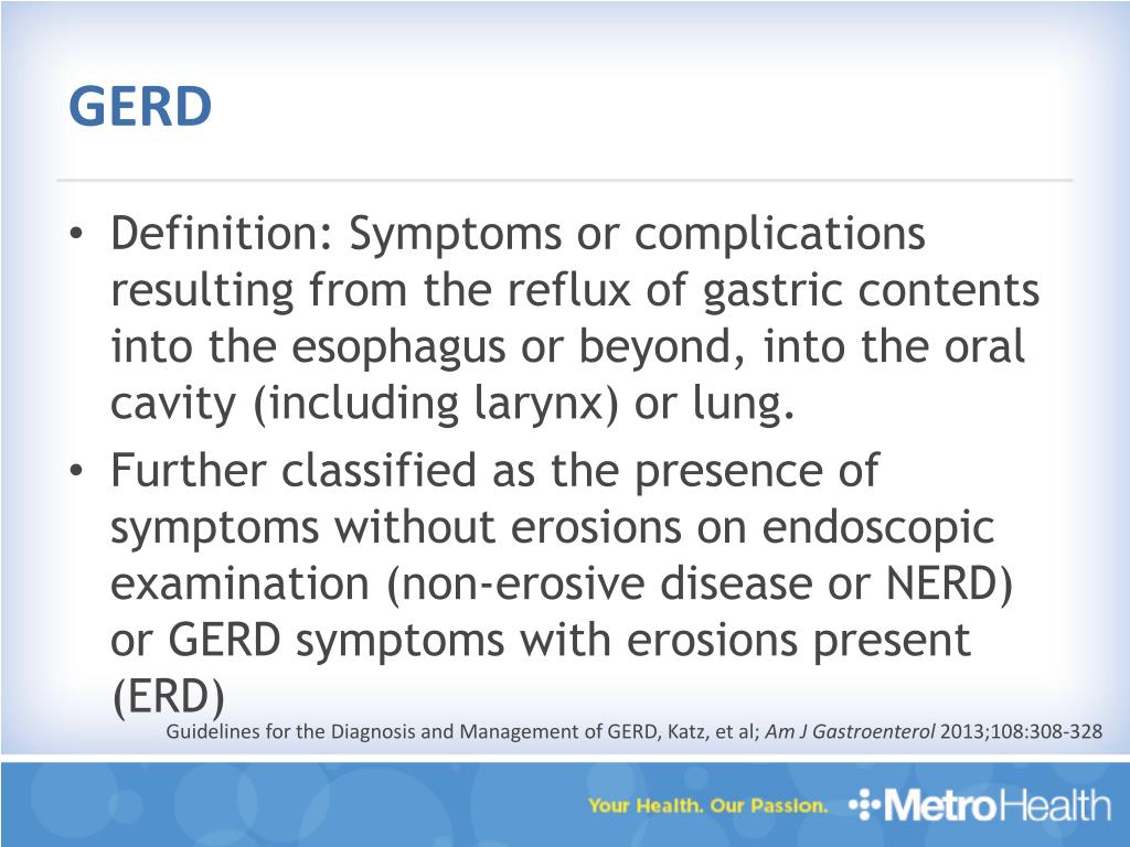 GERD • Definition: Symptoms or complications resulting from the reflux of gastric contents into the esophagus or beyond, into the oral cavity (including larynx) or lung. • Further classified as the presence of symptoms without erosions on endoscopic examination (non-erosive disease or NERD) or GERD symptoms with erosions present (ERD) Guidelines for the Diagnosis and Management of GERD, Katz, et al; Am J Gastroenterol 2013;108:308-328