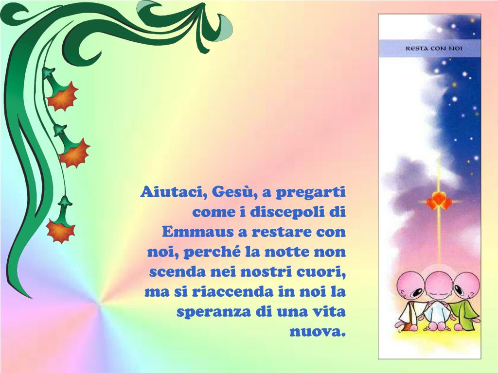 Aiutaci, Gesù, a pregarti come i discepoli di Emmaus a restare con noi, perché la notte non scenda nei nostri cuori, ma si riaccenda in noi la speranza di una vita nuova.