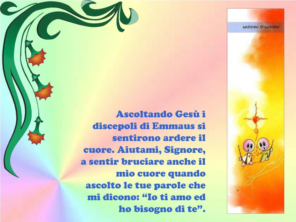 Ascoltando Gesù i discepoli di Emmaus si sentirono ardere il cuore. Aiutami, Signore, a sentir bruciare anche il mio cuore quando ascolto le tue parole che mi dicono: “Io ti amo ed ho bisogno di te”.