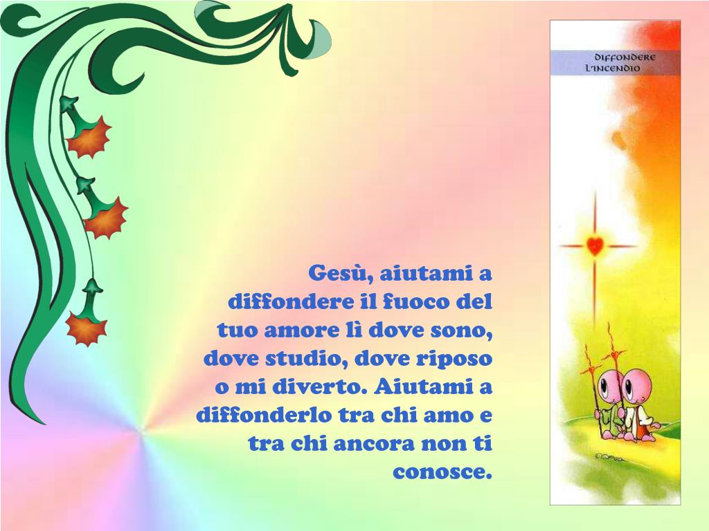 Gesù, aiutami a diffondere il fuoco del tuo amore lì dove sono, dove studio, dove riposo o mi diverto. Aiutami a diffonderlo tra chi amo e tra chi ancora non ti conosce.