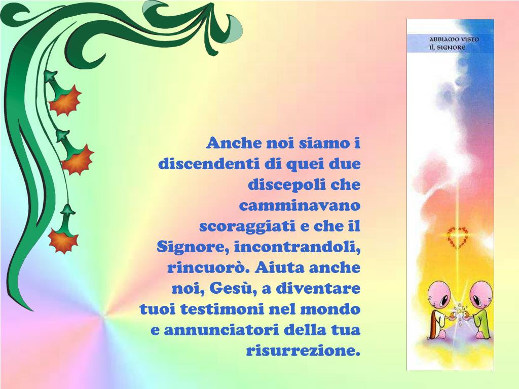 Anche noi siamo i discendenti di quei due discepoli che camminavano scoraggiati e che il Signore, incontrandoli, rincuorò. Aiuta anche noi, Gesù, a diventare tuoi testimoni nel mondo e annunciatori della tua risurrezione.