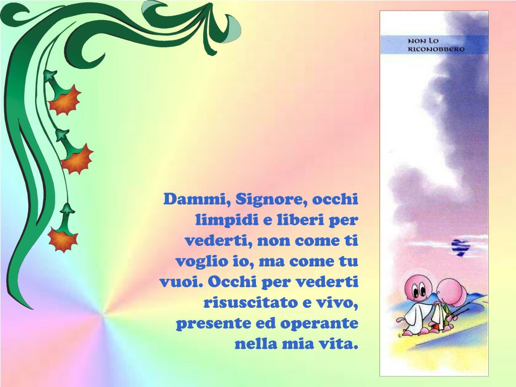 Dammi, Signore, occhi limpidi e liberi per vederti, non come ti voglio io, ma come tu vuoi. Occhi per vederti risuscitato e vivo, presente ed operante nella mia vita.