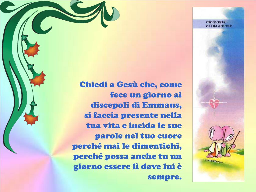 Chiedi a Gesù che, come fece un giorno ai discepoli di Emmaus,si faccia presente nella tua vita e incida le sue parole nel tuo cuore perché mai le dimentichi, perché possa anche tu un giorno essere lì dove lui è sempre.