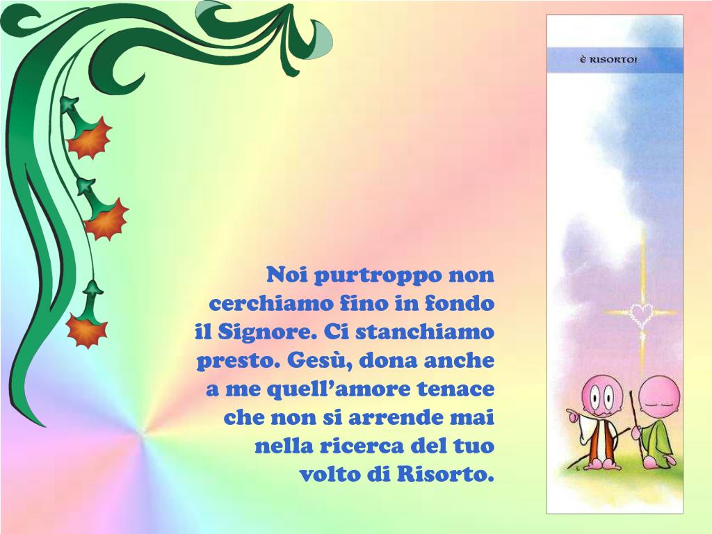 Noi purtroppo non cerchiamo fino in fondo il Signore. Ci stanchiamo presto. Gesù, dona anche a me quell’amore tenace che non si arrende mai nella ricerca del tuo volto di Risorto.