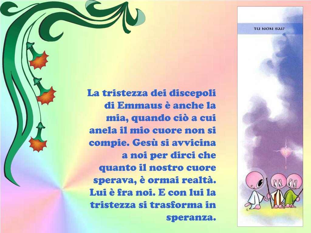 La tristezza dei discepoli di Emmaus è anche la mia, quando ciò a cui anela il mio cuore non si compie. Gesù si avvicina a noi per dirci che quanto il nostro cuore sperava, è ormai realtà. Lui è fra noi. E con lui la tristezza si trasforma in speranza.