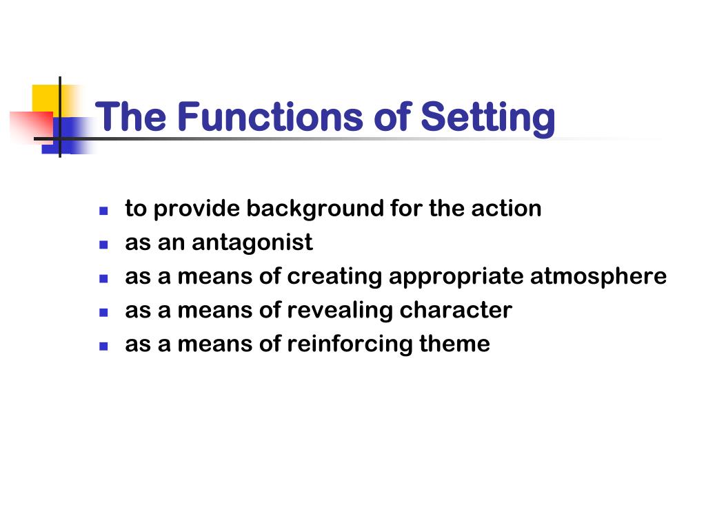 The Functions of Setting • to provide background for the action • as an antagonist • as a means of creating appropriate atmosphere • as a means of revealing character • as a means of reinforcing theme