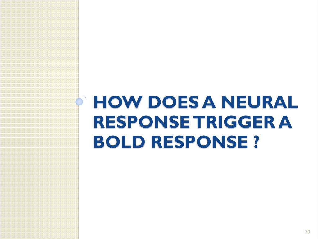 Decoding the BOLD response pattern Bloodflowincreases, oxygenretrievalis harder Residual ‘debt’ isdealtwith in a few secs / mins, O2 stocks are replenished Activitystarts, oxygenconsumptionincrease Vasodilation of arterioles Vasoconstriction of arterioles