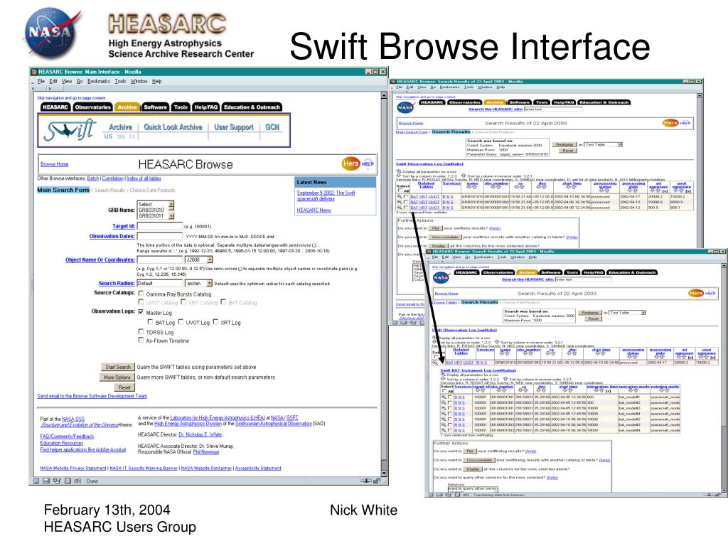 Preparations for Swift • New HEASOFT package • MOU delineating HEASARC responsibilities • End to end testing including archive ingest. • Customized mission interfaces: • Individualized interface to Browse • HTML wrappers for standard Browse scripts • Links between Browse tables • AKBAR: new service to import external information from observers • HEASARC responsible for some high-level data products – e.g., overall burst evolution • Mission requires rapid dissemination of data Nick White