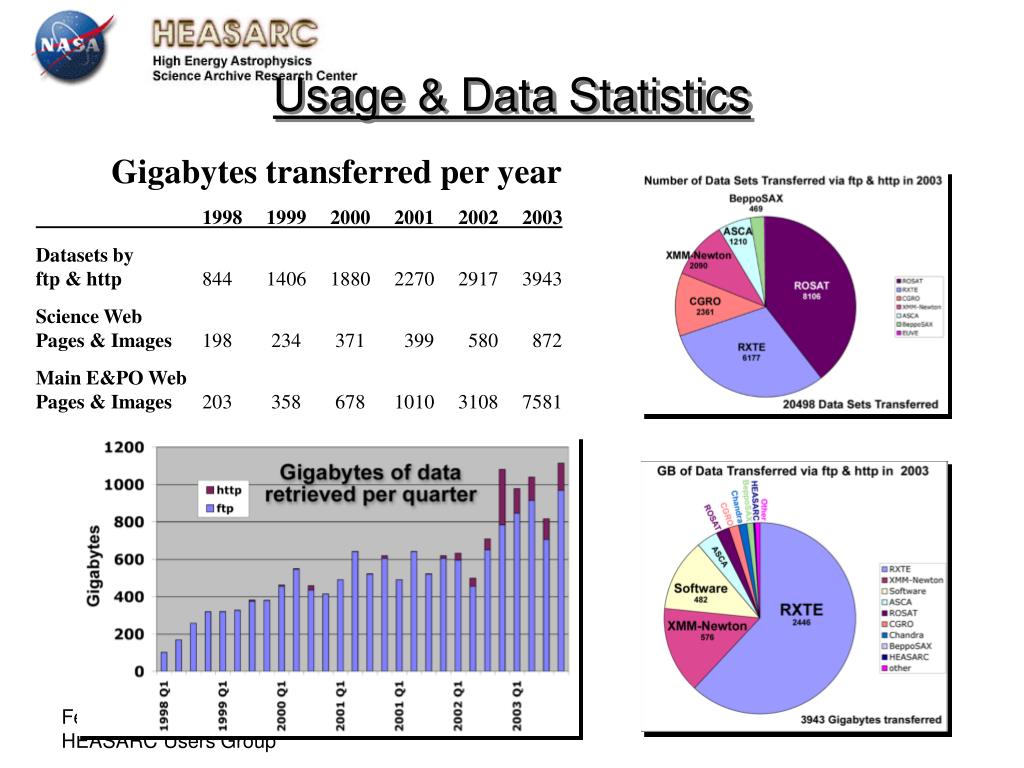 Usage & Data Statistics Gigabytes transferred per year 1998 1999 2000 2001 2002 2003 Datasets by ftp & http 844 1406 1880 2270 2917 3943 Science Web Pages & Images 198 234 371 399 580 872 Main E&PO Web Pages & Images 203 358 678 1010 3108 7581 Nick White