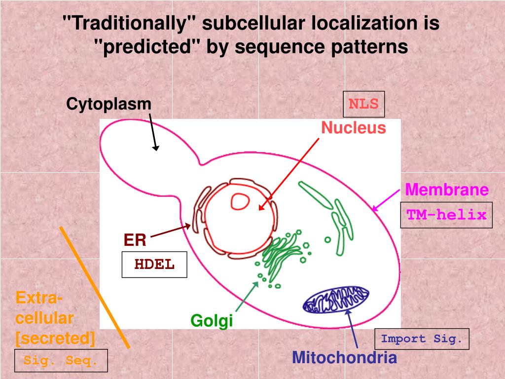 "Traditionally" subcellular localization is "predicted" by sequence patterns Cytoplasm NLS Nucleus Membrane TM-helix ER HDEL Extra-cellular[secreted] Golgi Import Sig. Mitochondria Sig. Seq.