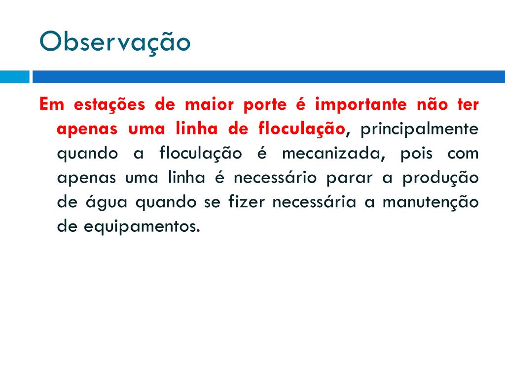 Observação Em estações de maior porte é importante não ter apenas uma linha de floculação, principalmente quando a floculação é mecanizada, pois com apenas uma linha é necessário parar a produção de água quando se fizer necessária a manutenção de equipamentos.