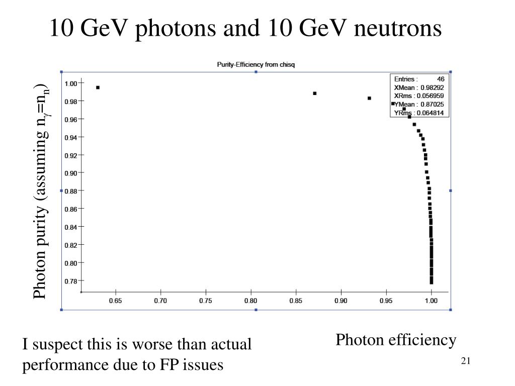 10 GeV photons and 10 GeV neutrons Photon purity (assuming ng=nn) Photon efficiency I suspect this is worse than actual performance due to FP issues