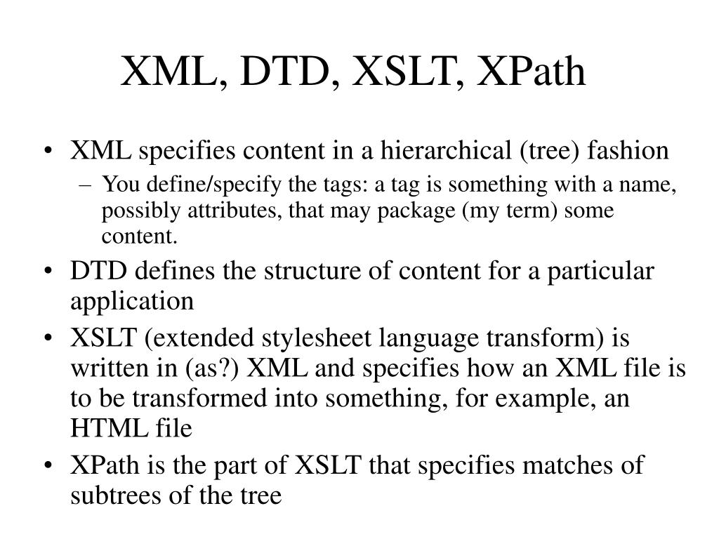 XML, DTD, XSLT, XPath • XML specifies content in a hierarchical (tree) fashion • You define/specify the tags: a tag is something with a name, possibly attributes, that may package (my term) some content. • DTD defines the structure of content for a particular application • XSLT (extended stylesheet language transform) is written in (as?) XML and specifies how an XML file is to be transformed into something, for example, an HTML file • XPath is the part of XSLT that specifies matches of subtrees of the tree