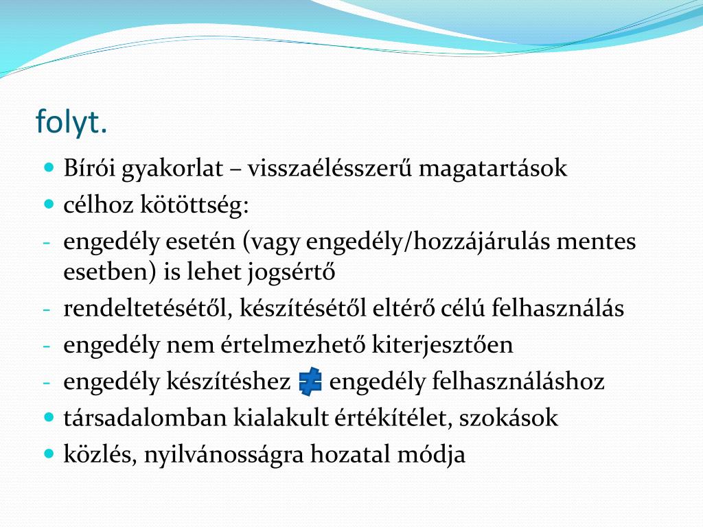 folyt. • Bírói gyakorlat – visszaélésszerű magatartások • célhoz kötöttség: • engedély esetén (vagy engedély/hozzájárulás mentes esetben) is lehet jogsértő • rendeltetésétől, készítésétől eltérő célú felhasználás • engedély nem értelmezhető kiterjesztően • engedély készítéshez engedély felhasználáshoz • társadalomban kialakult értékítélet, szokások • közlés, nyilvánosságra hozatal módja