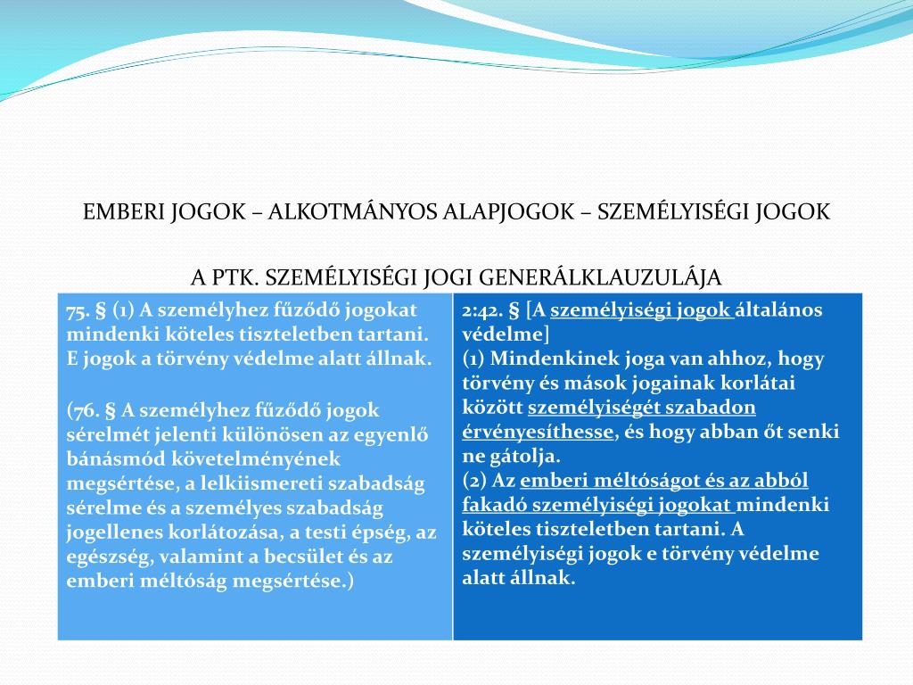 EMBERI JOGOK – ALKOTMÁNYOS ALAPJOGOK – SZEMÉLYISÉGI JOGOK A PTK. SZEMÉLYISÉGI JOGI GENERÁLKLAUZULÁJA
