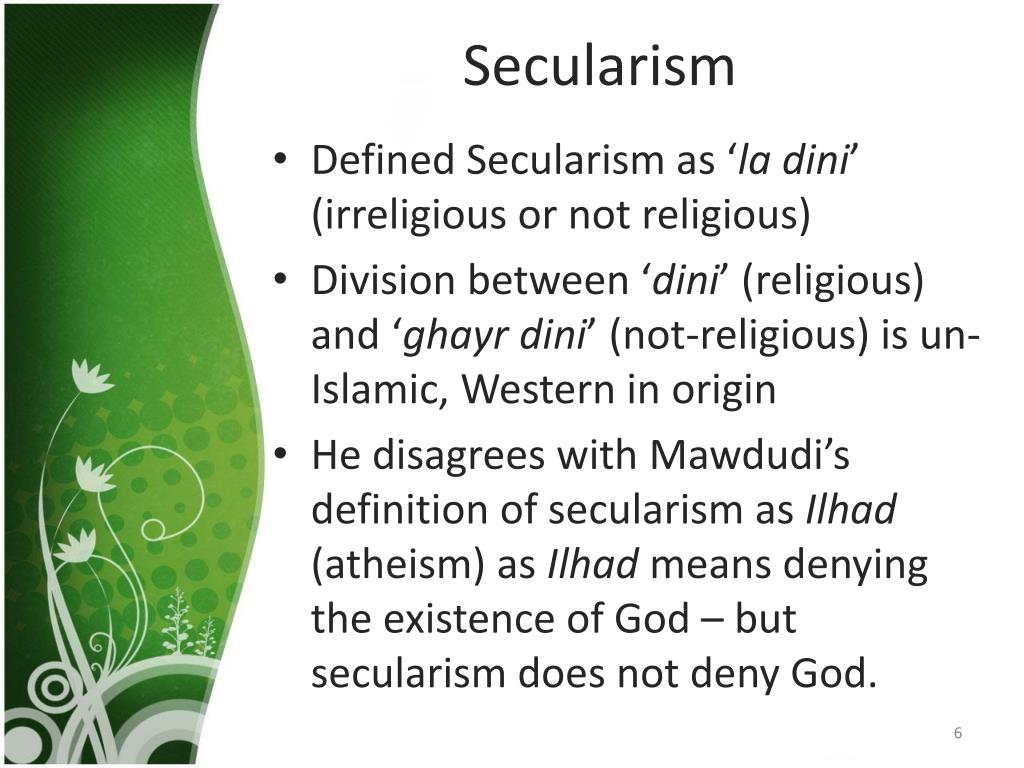 Secularism • DefinedSecularism as ‘la dini’ (irreligious or not religious) • Division between ‘dini’ (religious) and ‘ghayrdini’ (not-religious) is un-Islamic, Western in origin • He disagreeswithMawdudi’sdefinition of secularism as Ilhad (atheism) as Ilhadmeansdenying the existence of God – but secularismdoes not denyGod.