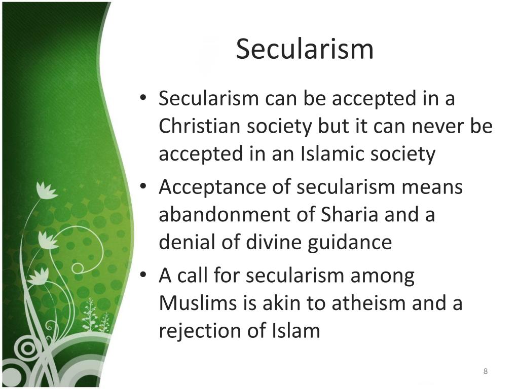 Secularism • Secularismcanbeaccepted in a Christian society but itcanneverbeaccepted in an Islamic society • Acceptance of secularismmeansabandonment of Sharia and a denial of divine guidance • A call for secularismamongMuslimsisakin to atheism and a rejection of Islam